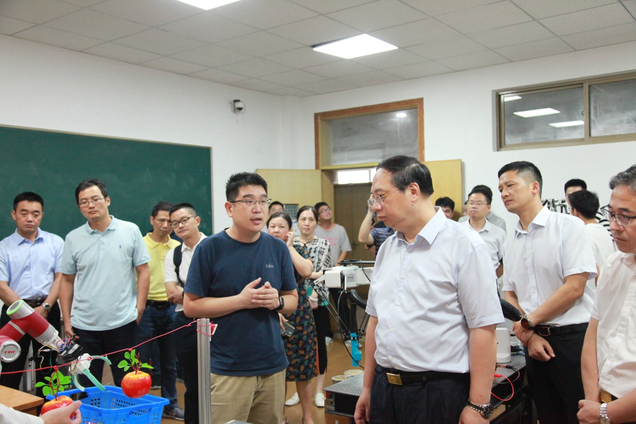 王宏一行首先参观了机械与自动控制学院“采摘机器人”实验室,现场观摩茶叶采摘机器人、番茄采摘机器人、草莓采摘机器人实验运行。