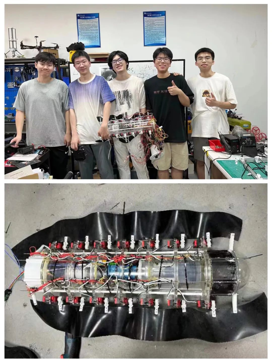 作品简介:对鳍式两栖仿生机器虫是一款模仿鳐鱼鳍结构运动的仿生机器人,旨在能够在水上和陆地的复杂环境代替人进行任务执行,包括在沼泽和沼泽地区以及沿海地区。此对鳍式两栖仿生机器人主要由活塞排水系统、鳍驱动系统、实时图像传输系统,人机交互系统,姿态控制系统。在水域中,鳍驱动系统可以改变鳍的运动模式使鳍进行上下摆动形成一种连续地正弦波,实现在水中的沉浮与游动;在陆地上,改变鳍的运动模式使鳍进行左右摆动形成一种连续的正弦波,实现在陆地上的爬行,实现在海陆两栖的功能。沉浮系统通过调节活塞中的水量控制机器人的上升与下降,使其能到达水域的不同深度。
