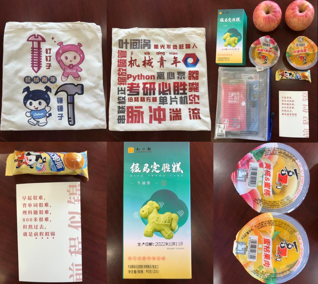 学院为考研学子精心准备“考研暖心礼包”,每一份礼物都寄托着学院对考研学子们的亲切关怀和殷殷祝福。牛奶代表着“牛”气冲天,定胜糕代表“糕”枕无忧,苹果象征着“苹”安上岸,果冻代表“果”然有你,棒棒糖代表“棒”上有名,一封写给自己的明信片以及考研专用文具套装,一件件寓意丰富、心意满满的物品被塞进了礼袋。
