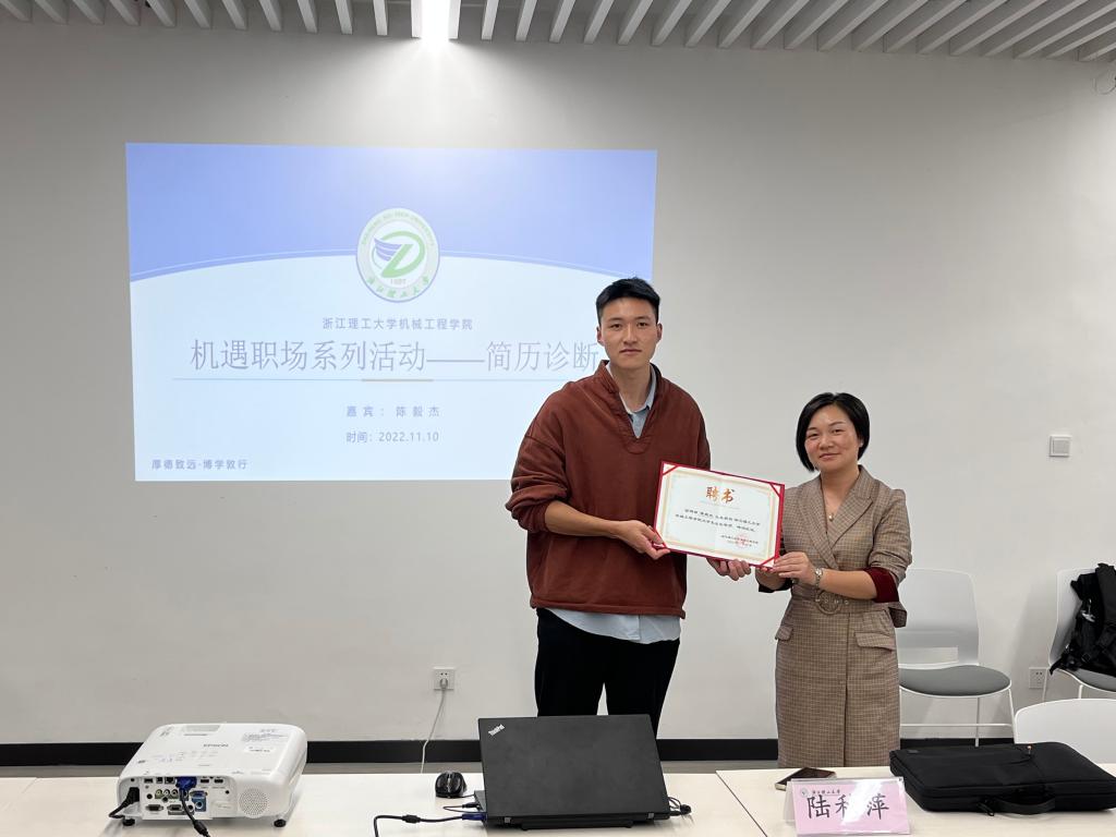 “机遇职场”——简历诊断专场活动在15-102会议室举行,本次活动邀请到了杭州老板电器股份有限公司的校招负责人陈毅杰、2019级本科生毕业班辅导员李晨曦作为简历诊断导师,学院党委副书记陆秋萍出席活动,并为陈毅杰颁发聘书,聘请其作为学院大学生成长导师。