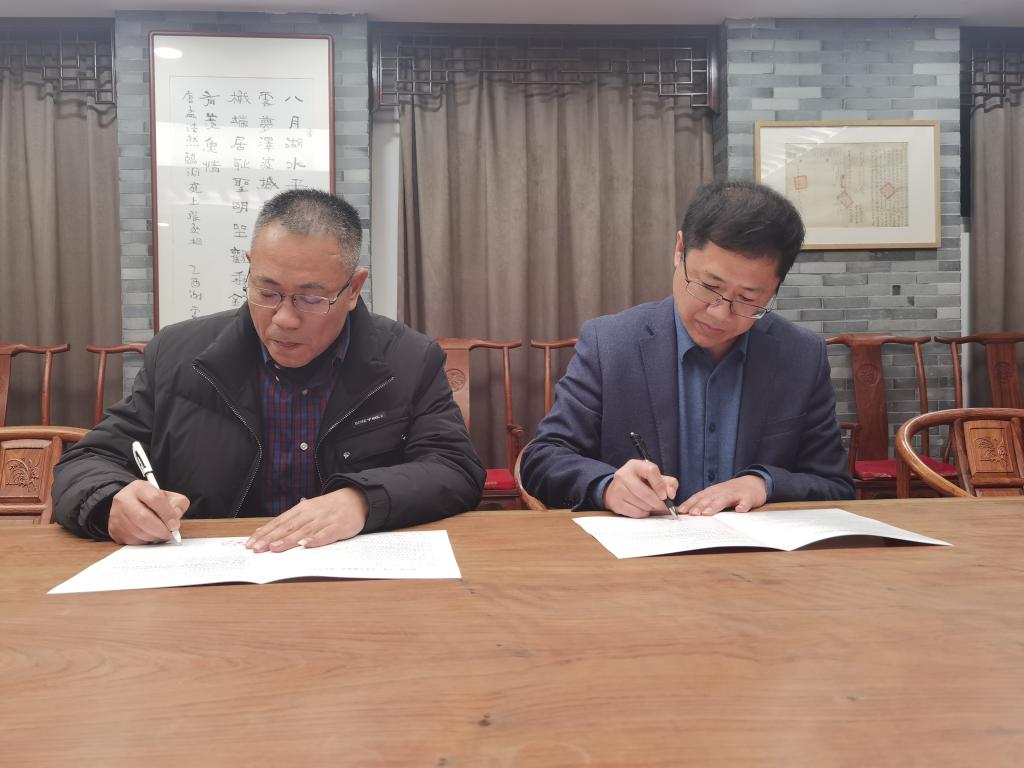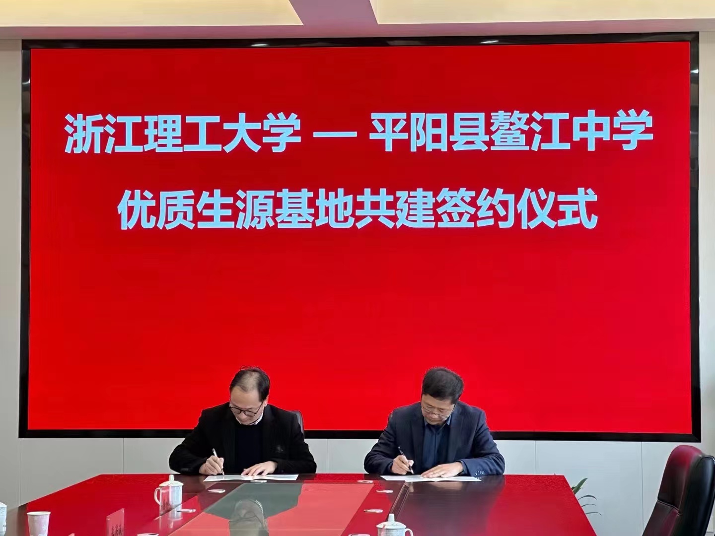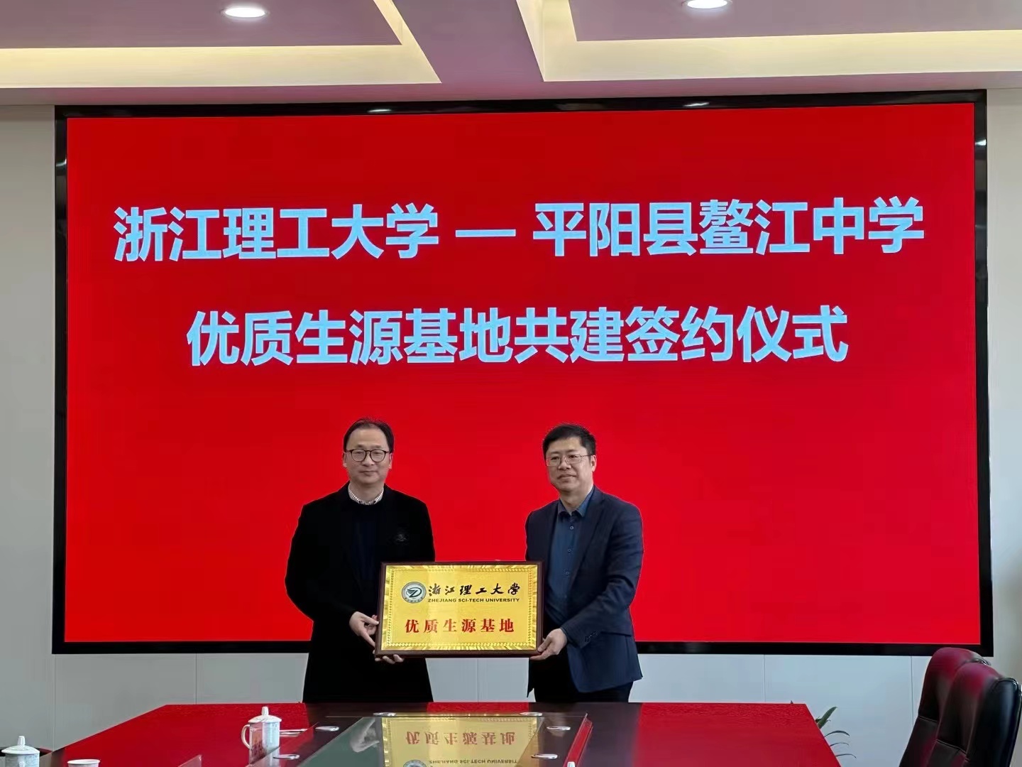 苏志俭与李伟君代表双方学校签订《优质生源基地协议书》。苏志俭代表浙江理工大学授予平阳县鳌江中学“优质生源基地”称号,李伟君代表鳌江中学接牌。