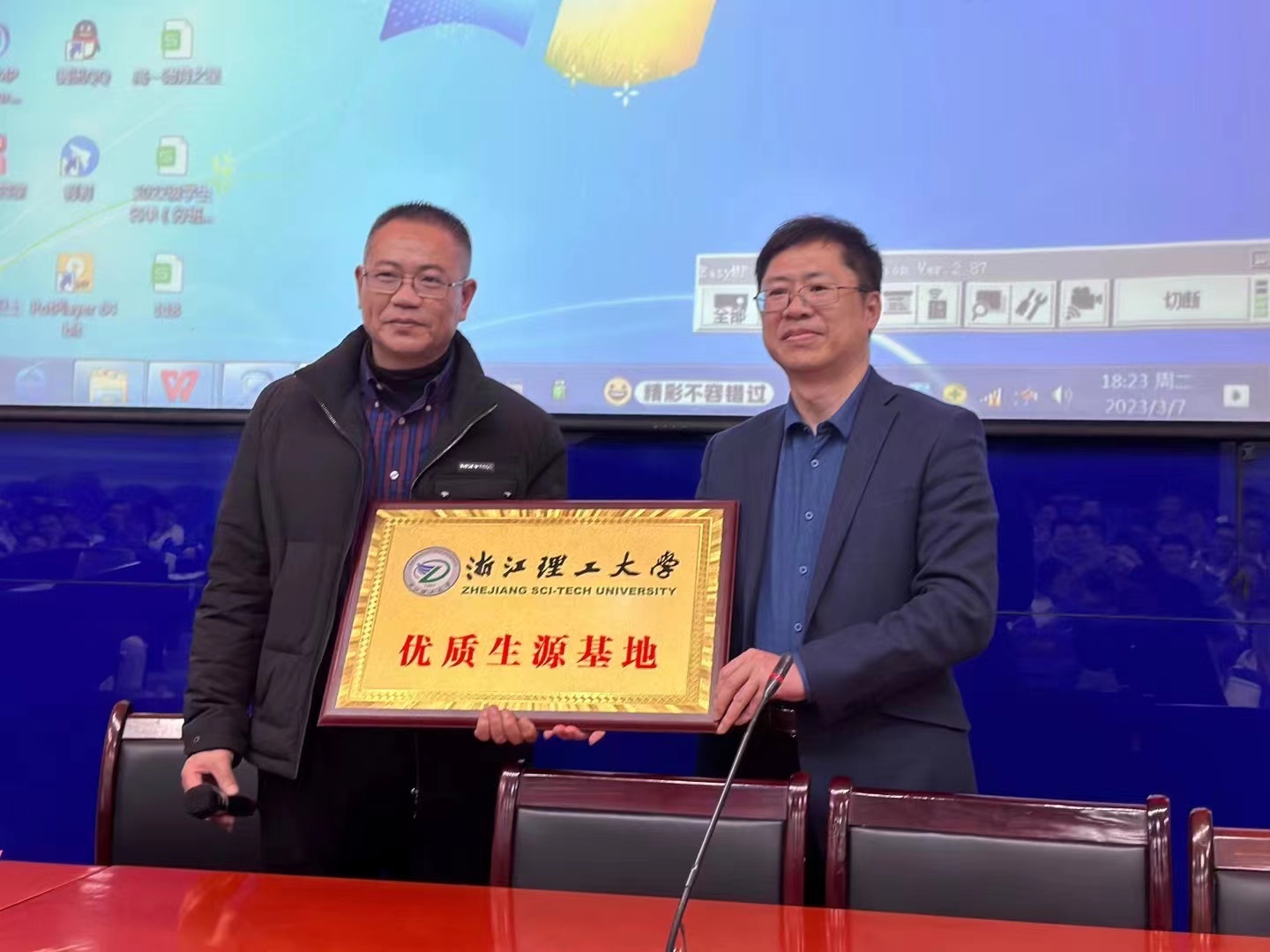 苏志俭与林浩代表双方学校签订《优质生源基地协议书》。苏志俭代表浙江理工大学授予浙江省平阳中学“优质生源基地”称号,林浩代表平阳中学接牌。