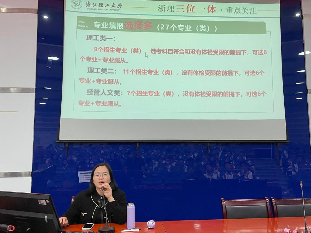会后,朱敏以“来浙理,成长为最好的自己”为主题,从学校的办学实力、专业特色、“三位一体”政策解读等方面为两所中学的高三学生进行宣讲。现场高三学子热情高涨,就学科专业、大学生活、招生政策等方面进行提问。朱敏耐心地一一进行解答,欢迎各位优秀学子报考浙江理工大学。